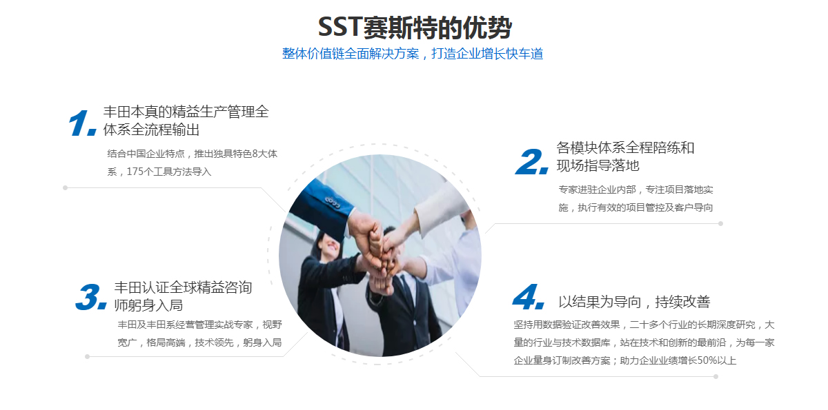 賽斯特集團(SST)是豐田為背景的一家致力于企業管理咨詢、培訓服務為主的國際化管理咨詢機構,依托于精益發源地豐田公司為背景的專家團隊,專業從事精益生產培訓和咨詢服務的管理咨詢機構,中國本土唯一一家融合日本豐田,北京現代,韓國三星等專家為一體的咨詢機構。旗下擁有:天津賽斯特企業管理咨詢公司,天津眾益天成管理咨詢公司,北京冠群精益管理咨詢公司,天津精益智能咨詢有限公司等四家分支機構。